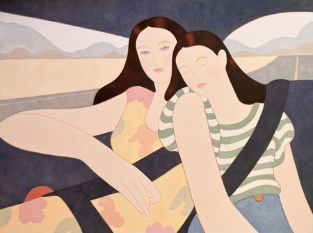 In muted colors and simplified lines, the figures pause on a park bench, stroll past a group of pink flamingos, and rest in the backseat of a car. They wear distinct outfits, from long dresses to patterned shirts, a common theme in Beeman’s work that reflects her own interest in fashion. Their expressions are relaxed but pleasant, as if embracing the hazy lull of the slow days. Offering few visual cues to identify her subjects, Beeman leaves the message up to the viewers and invites them to make their own narrative and personal connections to summer.