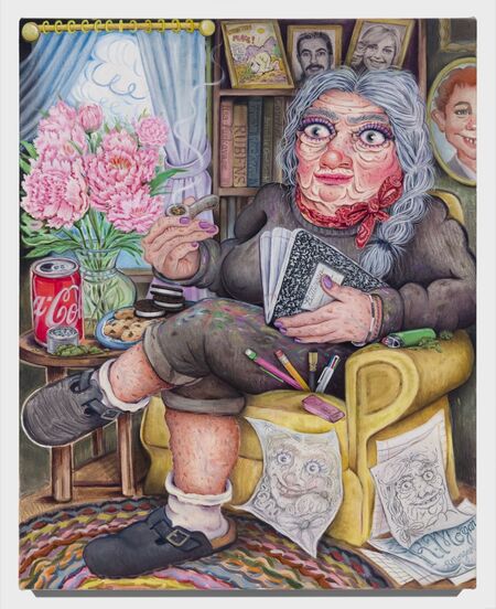 Indeed, the entire show depicts the artist at different stages of the exhibition process, beginning with her frazzled self-depiction in Self-Portrait on the First Day of Summer Break (First Day of Making This Show) (2023). Elsewhere, she looks to the future in another self portrait at age 100, which includes a small cartoon that reads: “What does it all mean?”