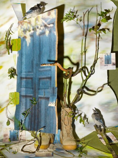 Reflecting the fragmented nature of memory and storytelling, as well as the biases inherent in historical narratives, Soleimani’s images resemble dreamlike episodes full of unexpected objects, pops of color, and symbols, such as the snake that appears often and alludes to the South Asian and Persian survival game of “snakes and ladders.” In rewriting her parents’ history, Soleimani draws attention to their pain and duress, as well as their resourcefulness, to honor their legacy and recognize broader stories of survival.