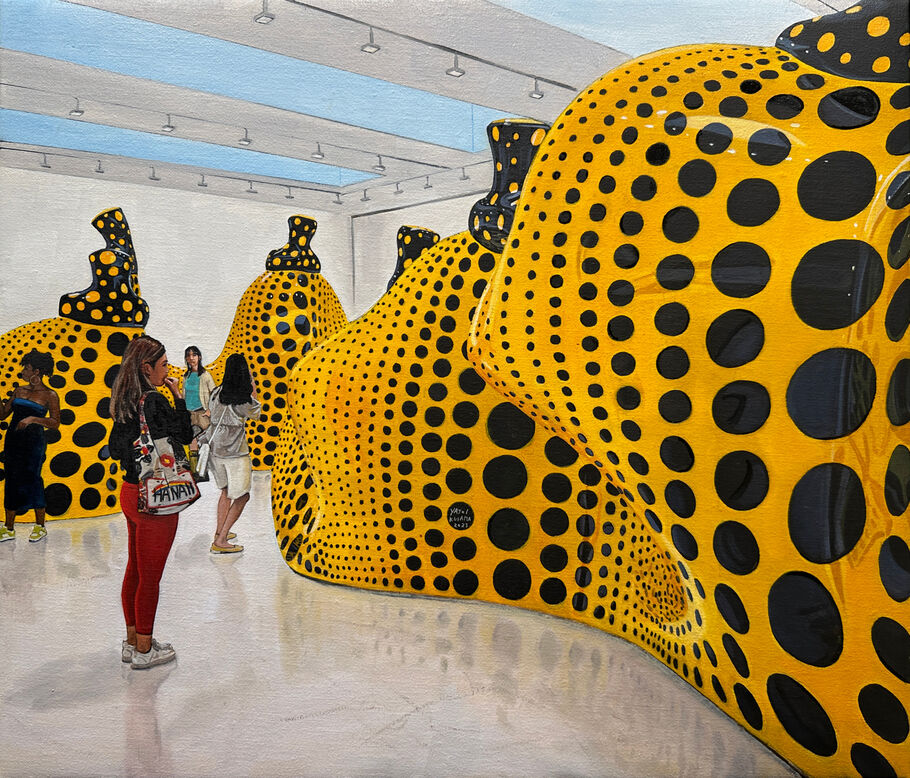 The paintings in the show build on nearly a decade of such works in which Fig travels across the country, documenting exhibitions as both a visitor and an artist. In some, his subjects are engrossed in the artworks they observe, such as the viewers staring in awe at a monumental Marilyn Minter painting. In others, interest wanes as people gaze into the distance or lean precariously over the edge of the railing in the iconic spiral of the Guggenheim, seemingly unfazed by the blockbuster Alex Katz show that surrounds them.
